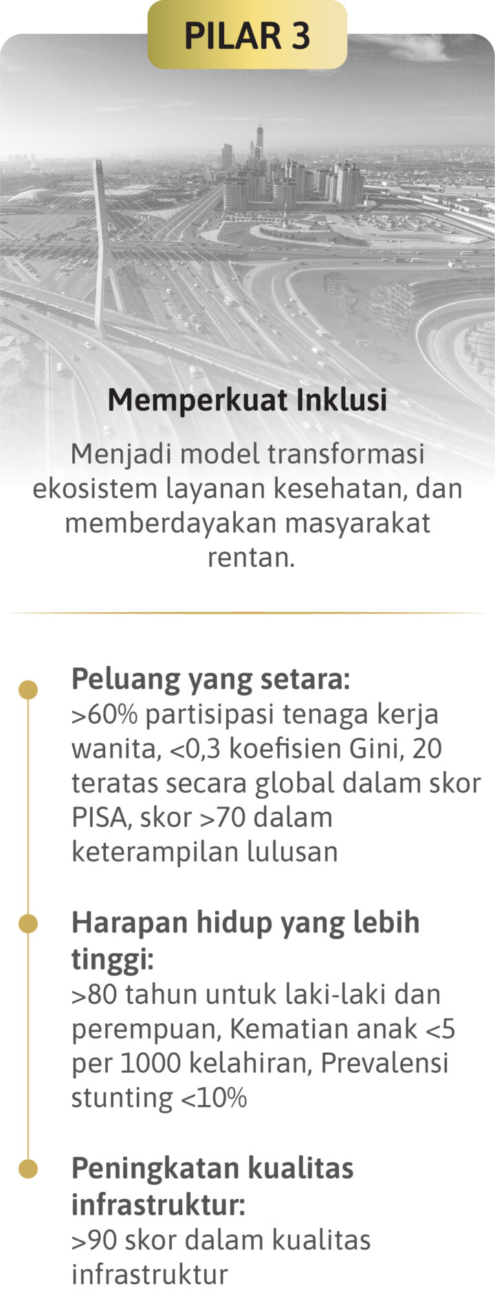 Seluruh pilar-pilar dalam Peta Jalan Indonesia Emas 2045 dapat terimplementasikan dan terwujud dengan ketersediaan SDM yang unggul dan kompeten sebagai enablers.